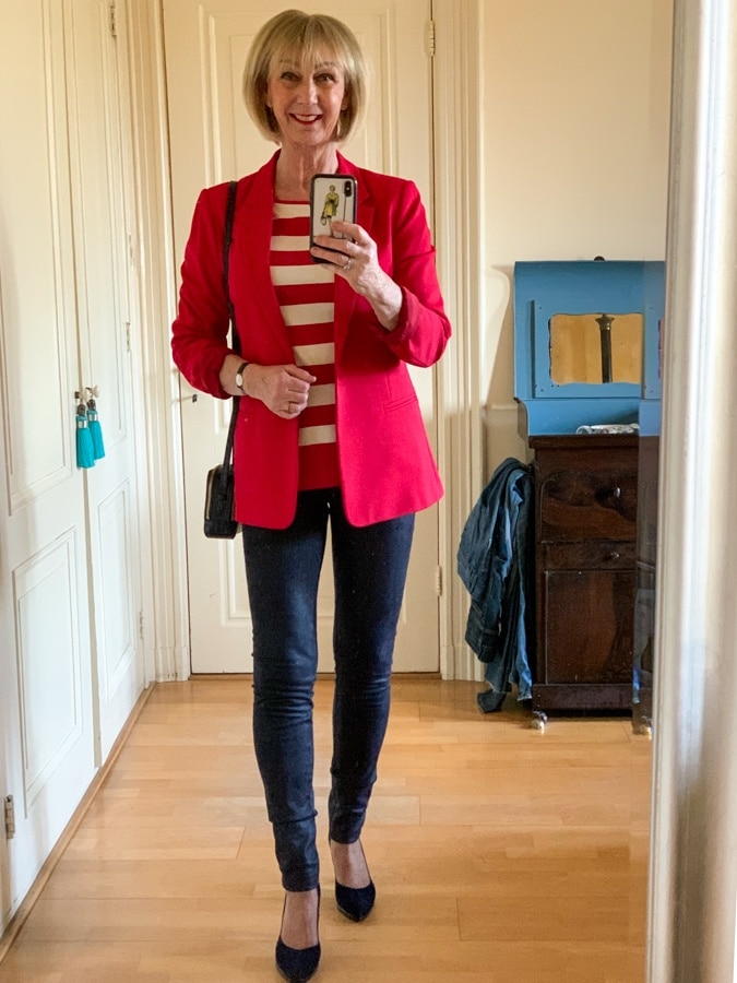 Below: I wore this outfit for my visit to Helga. You have seen it last week, but…I listened to the advice of two readers (thank you Linda V and Gee), who advised me not to cuff my jeans. They were so right; this is much better. The other change from last week’s styling is with a T-shirt instead of a shirt.