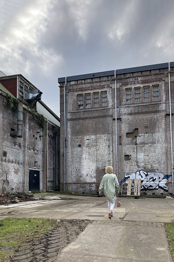 4. I love wide garments, oversize. I love wearing them and seeing them on beautiful bodies like yours. The color is very soft and beautiful and the casual outfit is perfect and very well integrated into the old industrial landscape in which the photos introduce us. I love your earrings, which I see in the beautiful foreground.