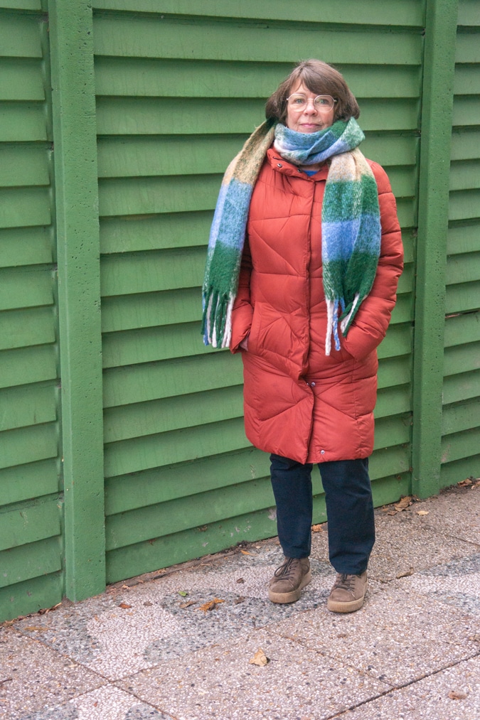 Below: Loes has a new coat and scarf. Snuggly warm for winter.