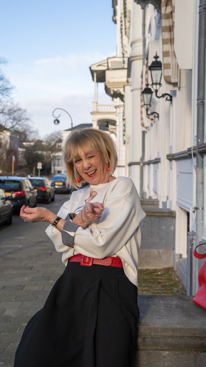 With mum I scrolled through the catalogue of an online clothes shop and ordered a couple of tops and jumpers. They arrived at my house and I took them with me as I picked her up to go to the hospital to have her eyes checked. She can try them on at her own pace and on Sunday I can take back the stuff that she doesn’t want. Below: Mum, wearing a polo neck underneath her cardigan. It has been around freezing point in the Netherlands and the energy costs have skyrocketed, so we have to put on extra layers.