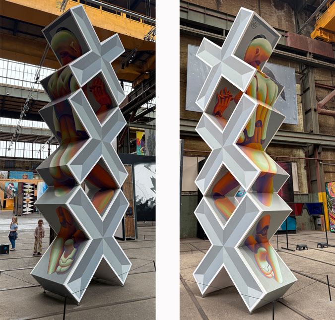 Below: The artwork below by Wild Drawing is photographed from two sides. Again, what a special effect. (By the way, three crosses under each other are the sign of Amsterdam.)