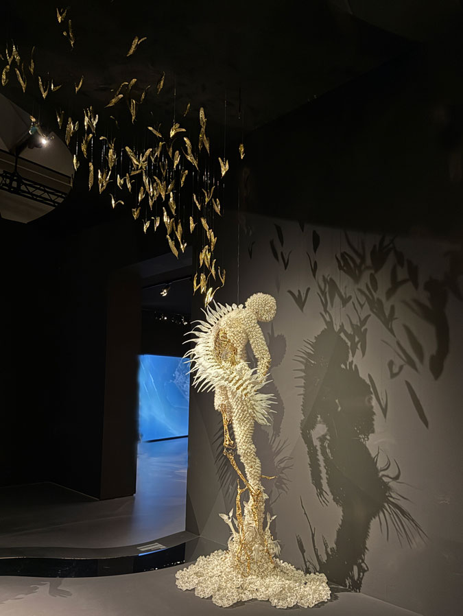 Below: Talking about art. Are the gold petals dressing the skeleton? Or are they leaving the body? Awesome. It might be that this is created in collaboration with another designer. She often works with others. Sorry, I don’t know.