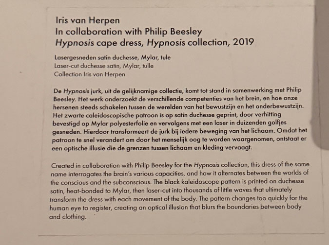Below: The Algae dress was in a glass box with a mist to keep the 125 million living bioluminescent algae alive. Yes, you read that correctly. More explanation underneath the photo in Dutch and in English.
