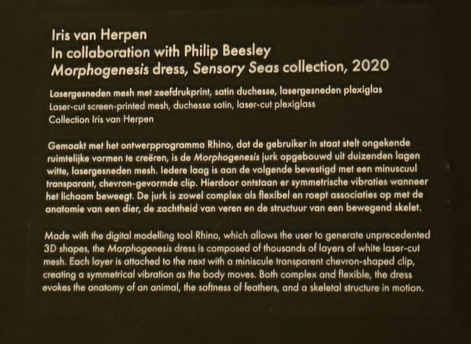 Below: Morphogenesis dress, again with the explanation underneath it. Iris van Herpen uses materials and techniques which are light years ahead of the rest of the industry. You might think ‘That is unwearable’, but A) it isn’t although perhaps more for performing artists and B) she is as much an artist as a dress maker.